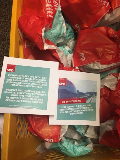 Der SPD Gemeindeverband Nordpfälzer Land hat heute in einer Zugverteilaktion eine schnelle, direkte und umsteigefreie Zugverbindung vom Alsenztal nach Mainz und Frankfurt gefordert.