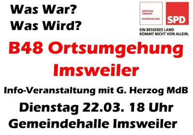 Unser Bundestagsabgeordneter Gustav Herzog hat heute mitgeteilt, dass dass das gemeinsame Engagement vieler verantwortlicher Politiker der SPD Früchte trägt. Die B48 Ortumgehung Imsweiler ist im VORDRINGLICHEN BEDARF eingestuft worden. Damit besteht für die Ortsumgehung Imsweiler jetzt ein klarer Auftrag!