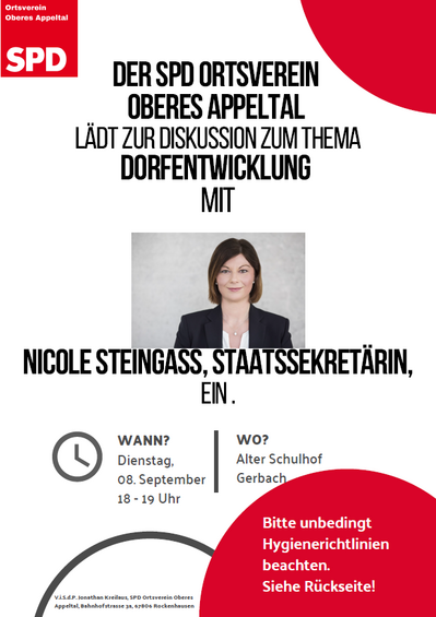Der SPD Ortsverein Oberes Appeltal lädt zu einer Diskussion zum Thema Dorfentwicklung mit Nicole Steingaß, Staatsserketärin im Innenministerium des Landes Rheinland-Pfalz am Dienstag den 08. September um 18 Uhr ein. Dabei soll es inbesondere um die Entwicklung eines innerörtlichen Neubaugebietes am Judenhof/Schneebergerstrasse gehen. Die Veranstaltung findet im freien auf dem alten Schulhof in Gerbach/Schulstrasse 4 statt. Besucher werden gebeten die geltenden Hygienerichtlinien einzuahlten.